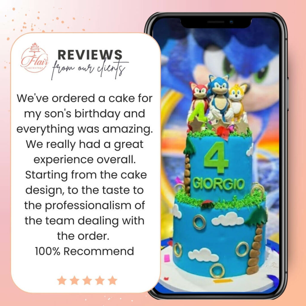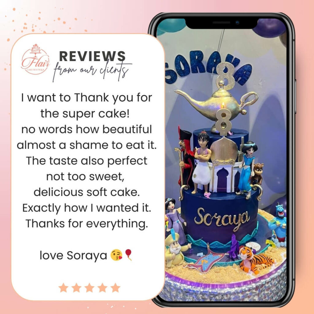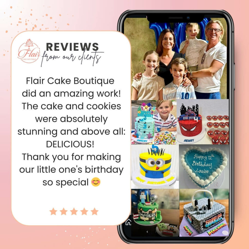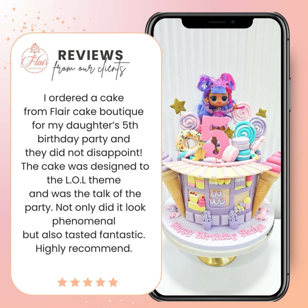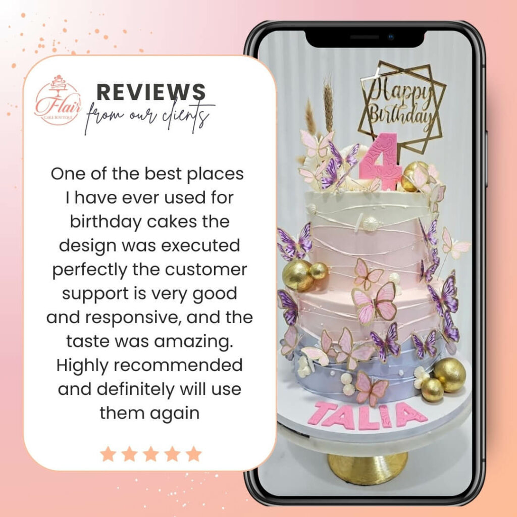 We pride ourselves on using only the best quality ingredients and working to the highest standards in all of our designs. Our cakes are created by Chef Cindy, who has over 16 years of experience working in the culinary world for some of the world’s best celebrity chef restaurants in Dubai. Don’t just take our word for it, check out our fabulous Google reviews to see what our satisfied customers have to say about the quality of our cakes.